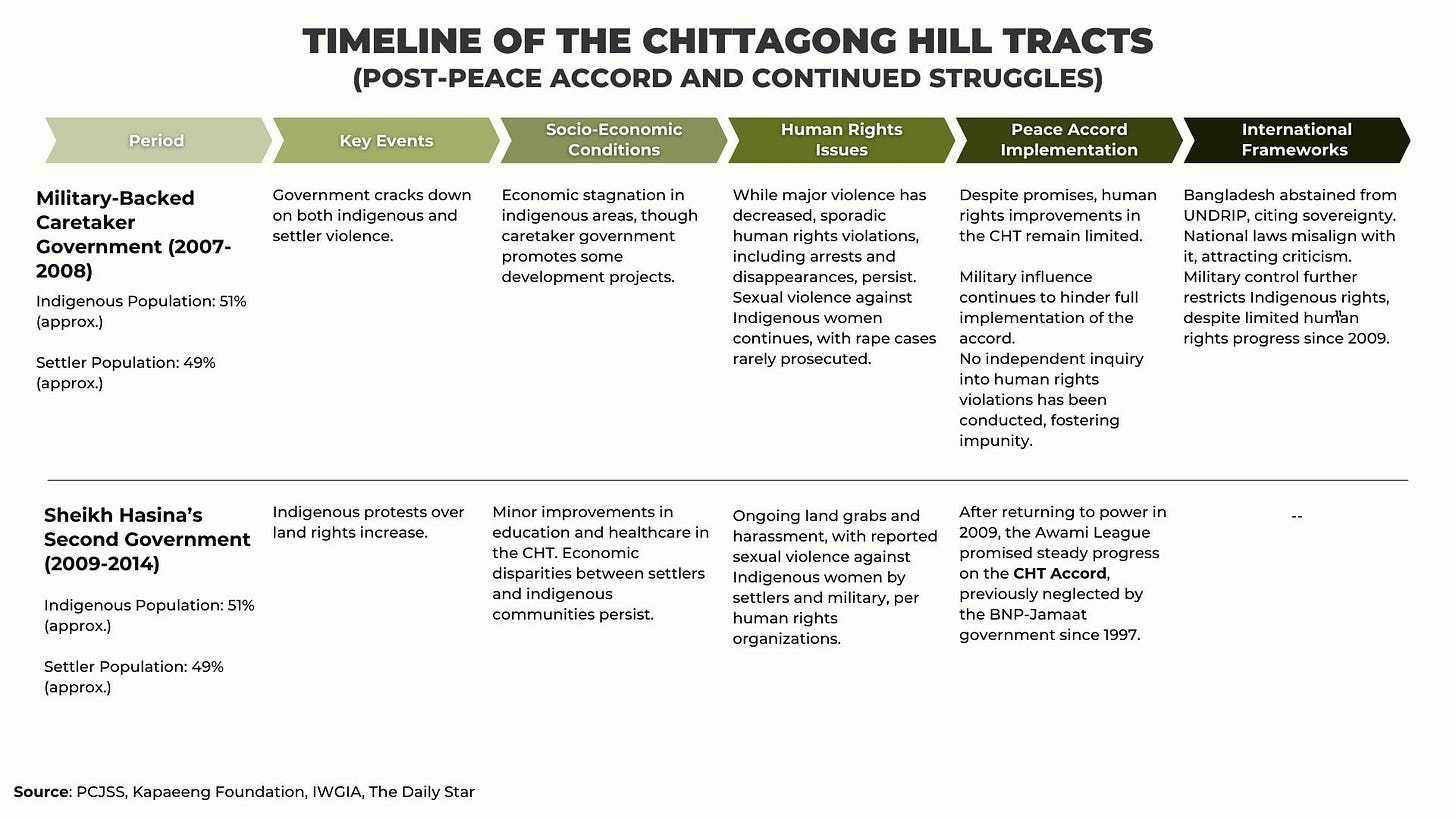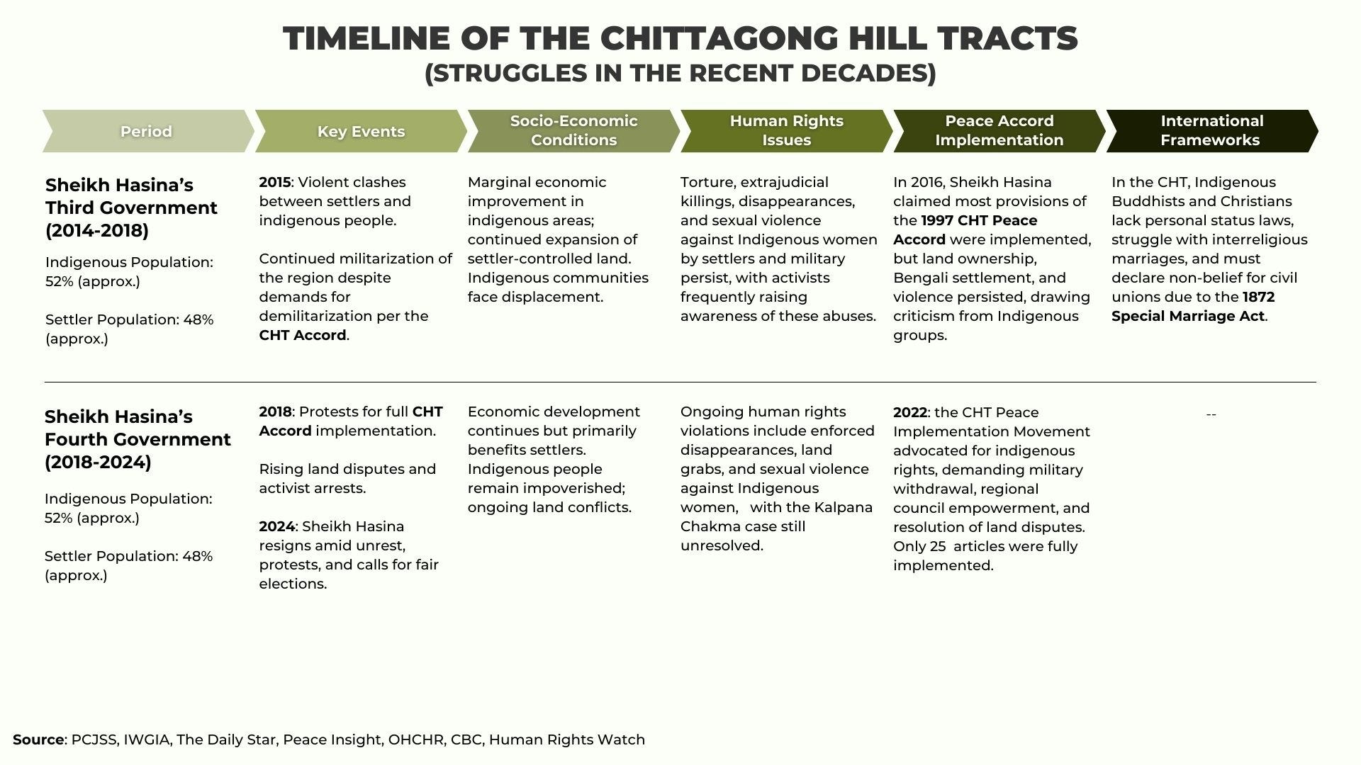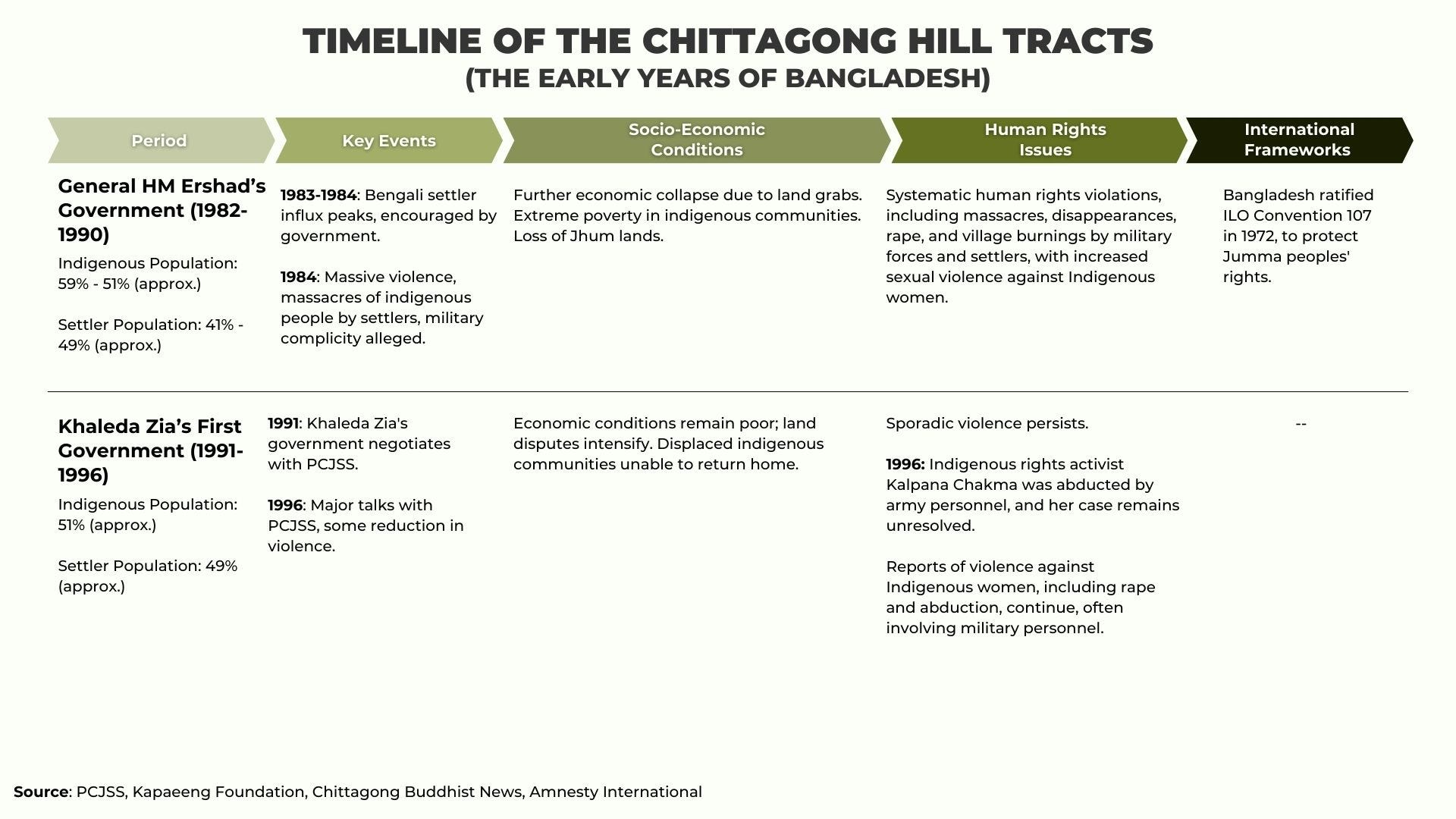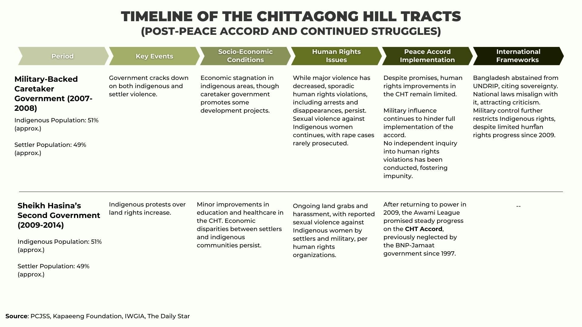 Takeaway Five: The timeline reflects a pattern of violence and rights violations against the Jumma people, including land displacement and socio-economic challenges, despite the existence of the Peace Accord and international frameworks. These conditions highlight the need for sustained attention to the structural issues that have persisted for more than a century.