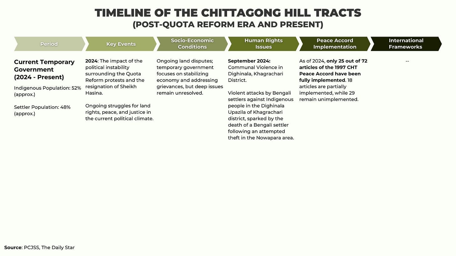 At present, the CHT hosts over 400 army, paramilitary, and police camps, along with six cantonments in the region. Recent communal attacks and incidents of arson in Khagrachari and Rangamati serve as reminders that the hills remain plagued by anti-Accord activities and discrimination against the Jumma people.
